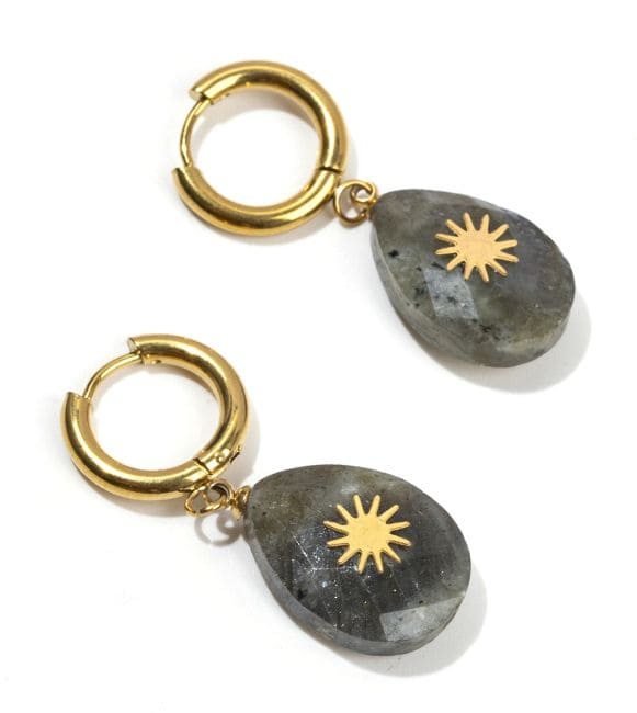 Inspirées par la déesse de la Lune et de l’indépendance, les boucles d’oreilles Artémis allient la puissance mystique de la labradorite à l’éclat doré du soleil. Symbole de protection et de renouveau, ce bijou illumine votre aura et vous accompagne sur le chemin de l’intuition et de la confiance en soi.