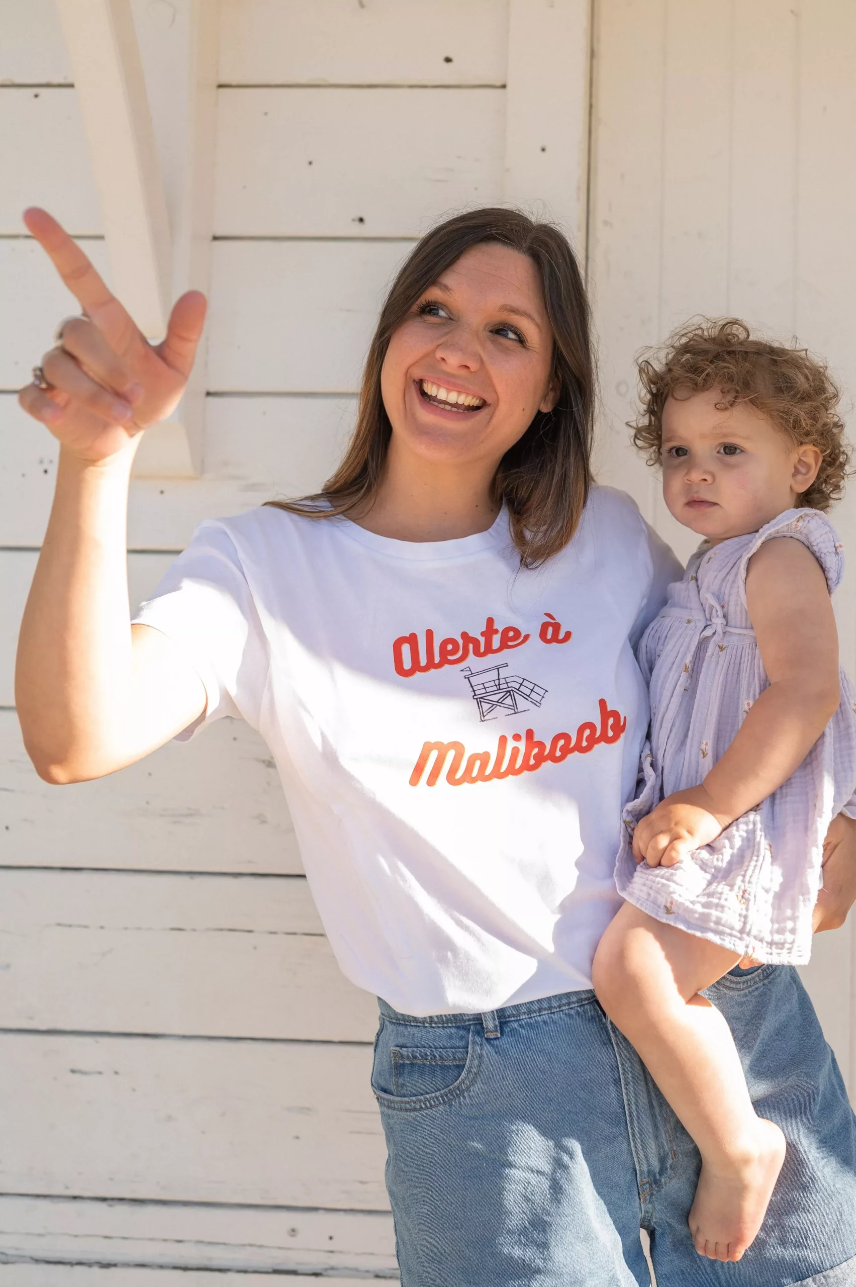 Le t-shirt d’allaitement de couleur blanche possède des manches courtes et est printé « Alerte à Maliboob » en rouge et noir.